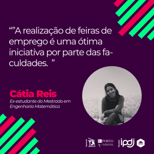 “Sou licenciada em Bioquímica e mestre em Medicina e Oncologia Molecular. Atualmente trabalho numa empresa relacionada com a minha área de formação, sediada no Porto. Eventos como as feiras de emprego foram cruciais para conseguir expandir o meu leque de conhecimento em relação a empresas e grupos de investigação que trabalham em diversas áreas. Para além de ter conseguido escrever uma lista de diversos locais, foi-me também possível contactar com pessoas que já aí trabalhavam e ter o seu feedback em relação ao trabalho que desenvolvem.