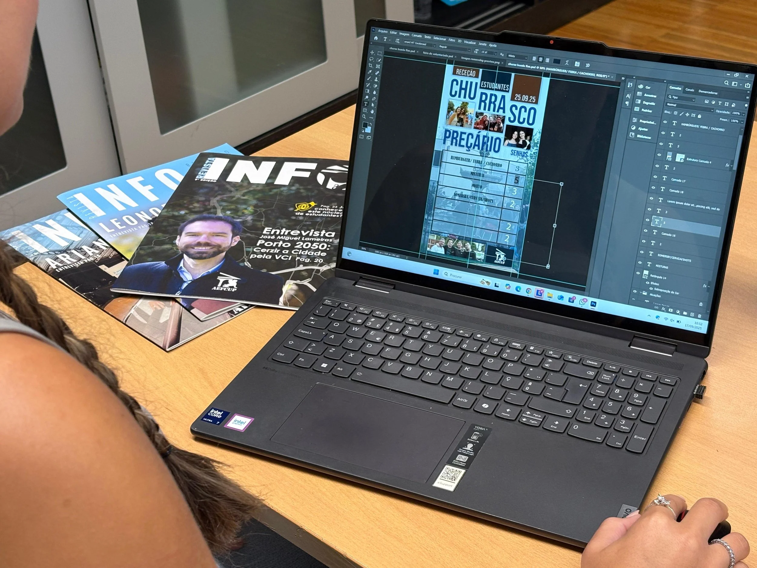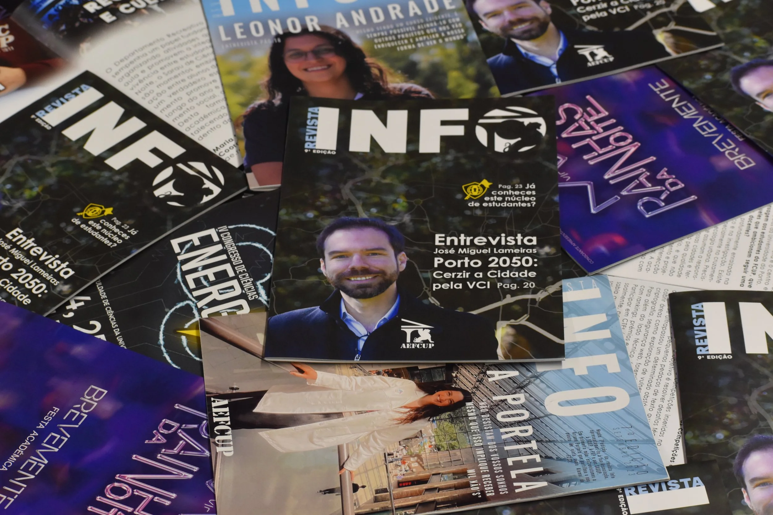 Também temos o orgulho de ser responsáveis pela criação da revista Info, uma publicação anual que reúne todas as informações essenciais para quem deseja se integrar e aproveitar ao máximo a experiência na FCUP.